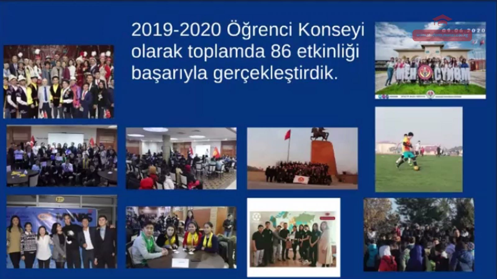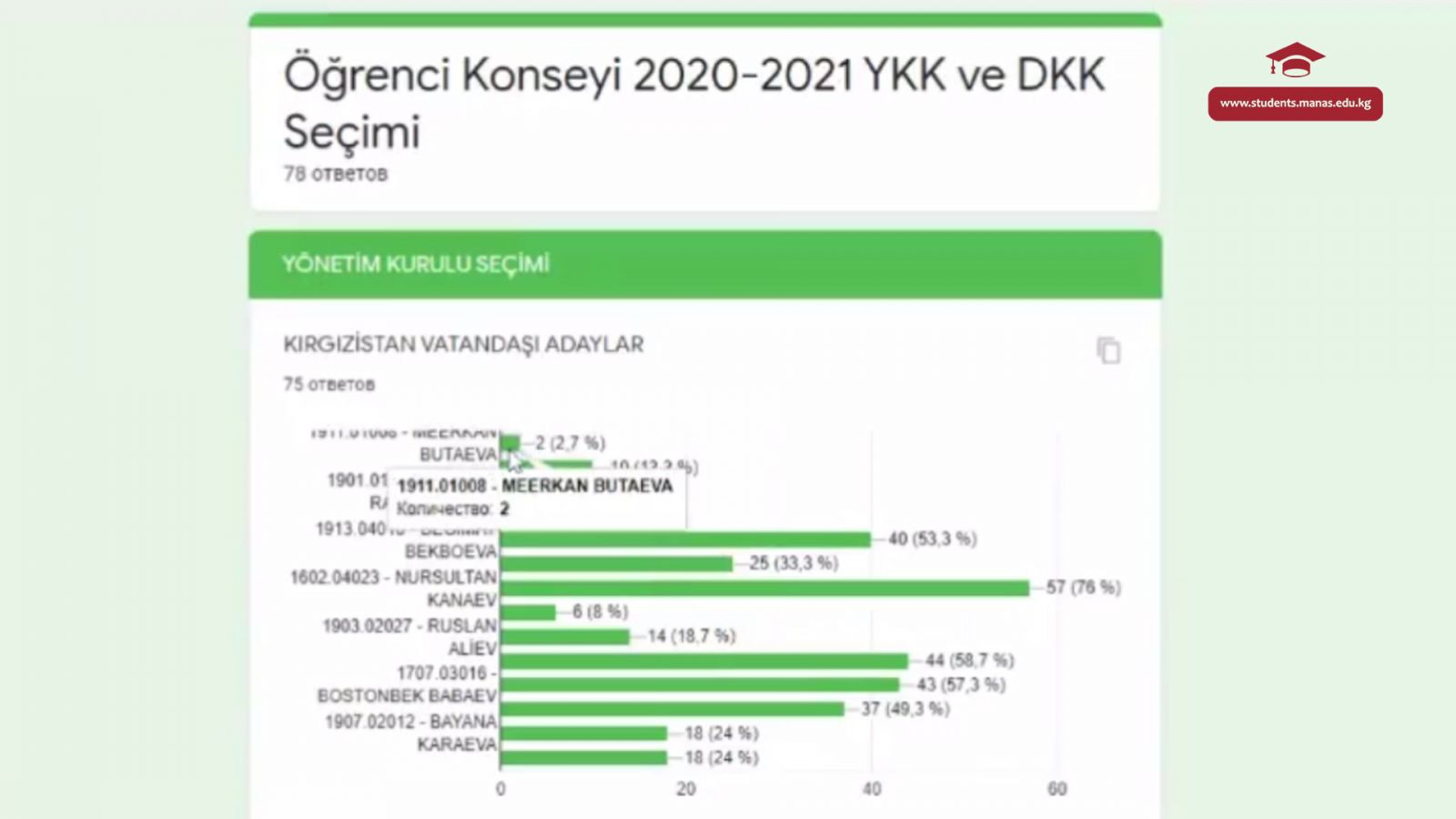 因为有2名学生理事会主席候选人,今年的选举与上一年相比更大。 18名学生被提名为学生管理部,6名学生被提名为纪检部 。选举产生的结果是,Osman Yigen,Nursultan Kanayev,Raisa Yerlanbek,Bostonbek Babayev,KanikeyTurdubekova,Begimay Bekboyeva,Rispek Kubanıchbekov被选为管理部成员。 Muzhteba Pek,Kemran Tabdigov,Azhar Matraimova当选为纪检部成员。